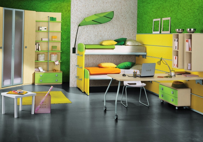 Wnętrza z podziałem na strefy w pionie lub poziomie również wyglądają imponująco. Możesz więc wybrać różne odcienie i udekorować pokój dla dwójki dzieci.
