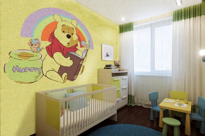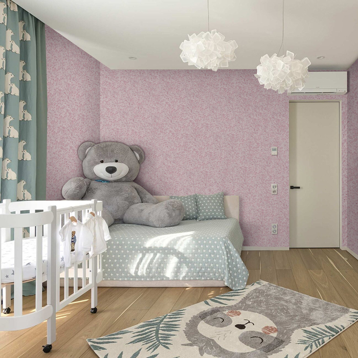 Oceń tekstylne powłoki tynkarskie w szkółce ze zdjęcia. Tutaj możesz zobaczyć piękny centralny wzór w pokoju dziecięcym, oryginalne dekoracje abstrakcyjne lub tematyczne dla nastolatków, urocze wzory odpowiednie dla dziewczynek i chłopców.